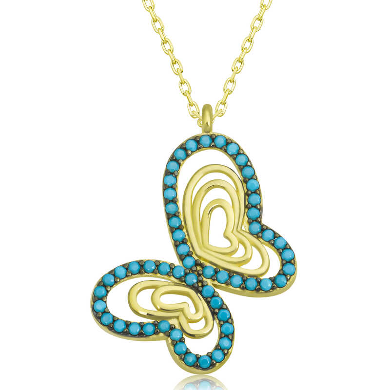 Gümüş Gold Turkuaz Taşlı Kelebek Kadın Kolye