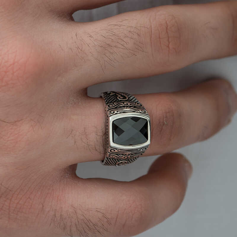 Gümüş Kesme Taşlı Desenli Erkek Yüzük