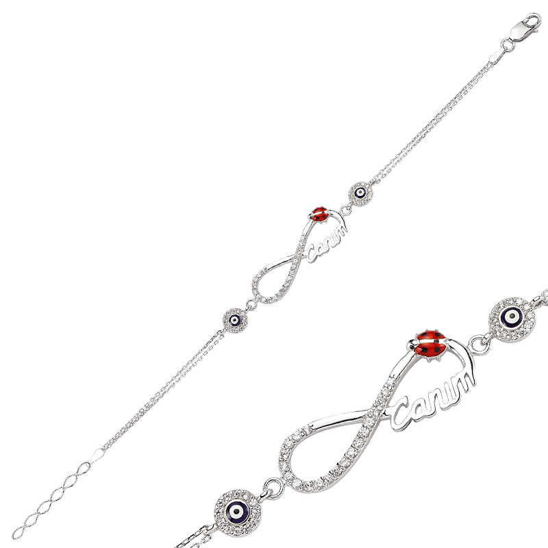 Sevdiklerinize sonsuz aşkı ifade etmenin en güzel en anlamlı yollarından biride bu nazar boncuklu sonsuzluk bilekliktir. Sevdiklerinize hediye edeceğiniz bu özel gümüş bileklik ile ona olan sonsuz sevginizi ifade edebilir sonsuza kadar birlikte olacağınız mesajı verebilirsiniz. Bu şık bileklik modeli 925 ayar gümüşten imal edilmiştir. Gümüş üzerine rodyum kaplama yapılmıştır. Rodyum kaplama yapılan bayan gümüş bileklik modelleri parlaklığını uzun süre muhafaza eder, oksitlenmesi gecikir. Tüm bileklik modellerimiz de olduğu gibi gümüş nazarlı sonsuzluk canım bayan bileklik modeli de el emeği ile üretilmiştir. Gümüş ve değerli taşlar nedeniyle belirtilen ortalama ürün ağırlığında ± %10 sapma olabilmektedir.